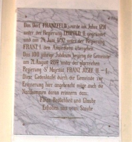 Die Jubiläumstafel der Franzfelder zum 100jährigen Bestehen der Ortschaft wurde von der bürgerlichen Gemeinde neu angefertigt - zusammen mit einer Tafel in serbischer Sprache - und ist im Prunksaal des Rathauses angebracht.